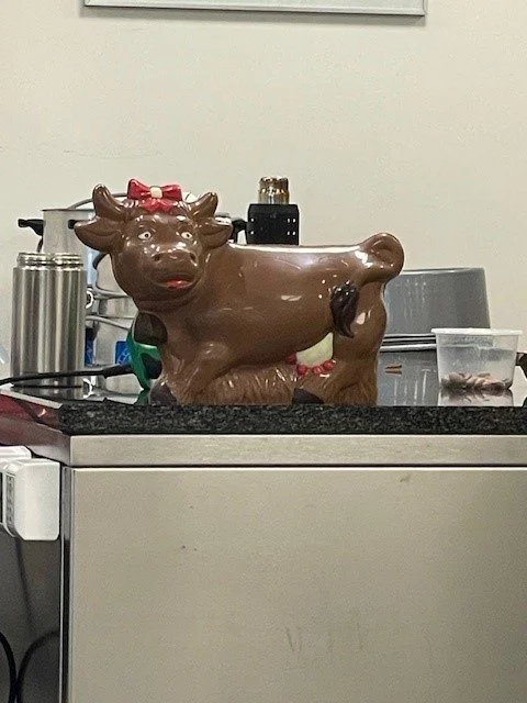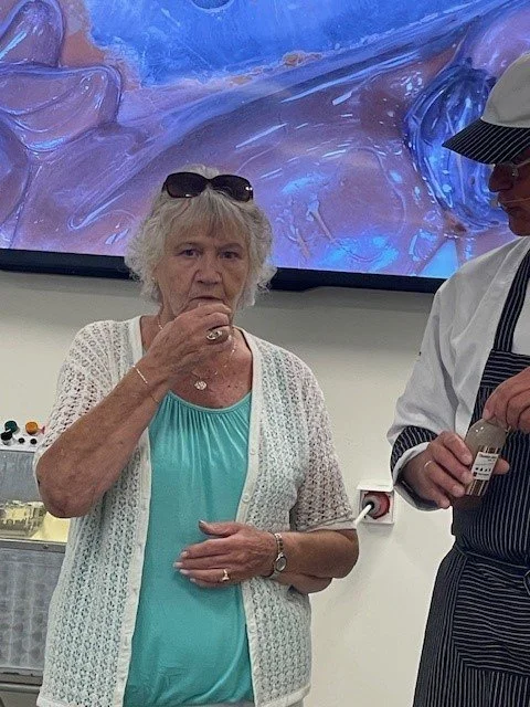 Daar aangekomen worden we door Frits van Noppen hartelijk ontvangen en al gauw blijkt dat Frits een gepassioneerd ambachtsman is die al ruim 25 jaar zijn zaak runt. We gaan eerst aan de koffie met een chocolade gebakje, daarna toont Frits ons een film van zijn reis naar Tanzania waar de cacaoboon groeit. Hij vertelt er met zoveel passie en heel veel humor over dat we allemaal aan zijn lippen gekluisterd zitten. Na de film begint het echte werk; Frits neemt ons mee in het proces van het maken van bonbons en chocolade figuren en uiteraard moeten deze bonbons door ons gekeurd worden. De grote door hem gemaakte chocolade koe wordt door één van ons gekocht en gaat mee naar huis. Na de demonstratie kan iedereen shoppen in de winkel die erbij hoort en daar wordt ruimschoots gebruik van gemaakt. We hoeven niet bang te zijn dat alles wat we gekocht hebben gaat smelten onderweg want alles gaat onderin de bus mee in grote koelboxen; super goed geregeld.