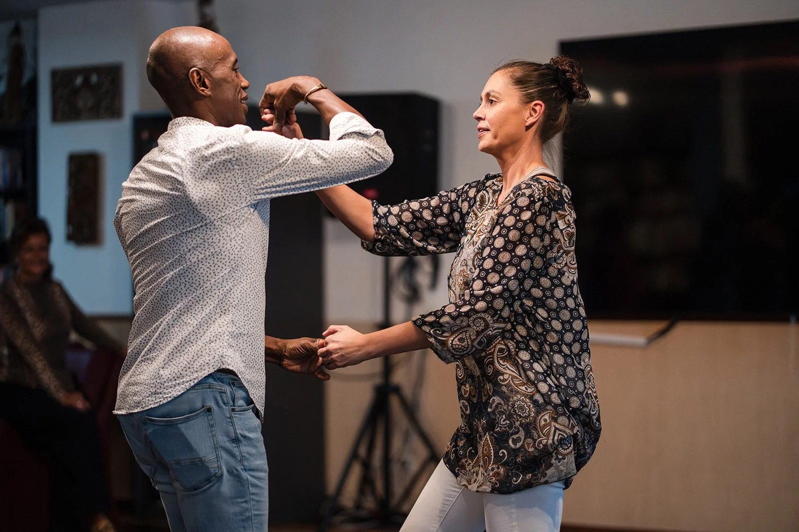 De zaal vult zich langzaam met een warme, vrolijke energie. Uit de speakers klinkt opzwepende salsamuziek; de ritmische klanken van trommels, trompetten en maracas toveren meteen een glimlach op ieders gezicht. De vloer glanst onder het zachte licht en overal zie je mensen nieuwsgierig om zich heen kijken. Sommigen zijn wat onwennig, maar iedereen heeft er zin in.