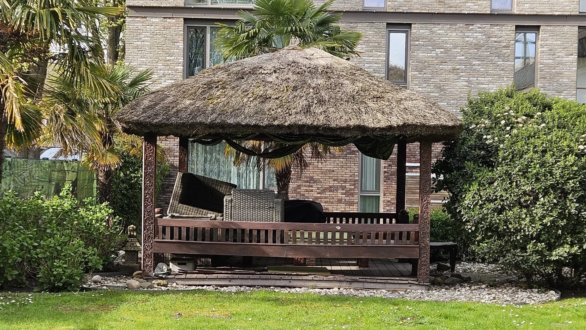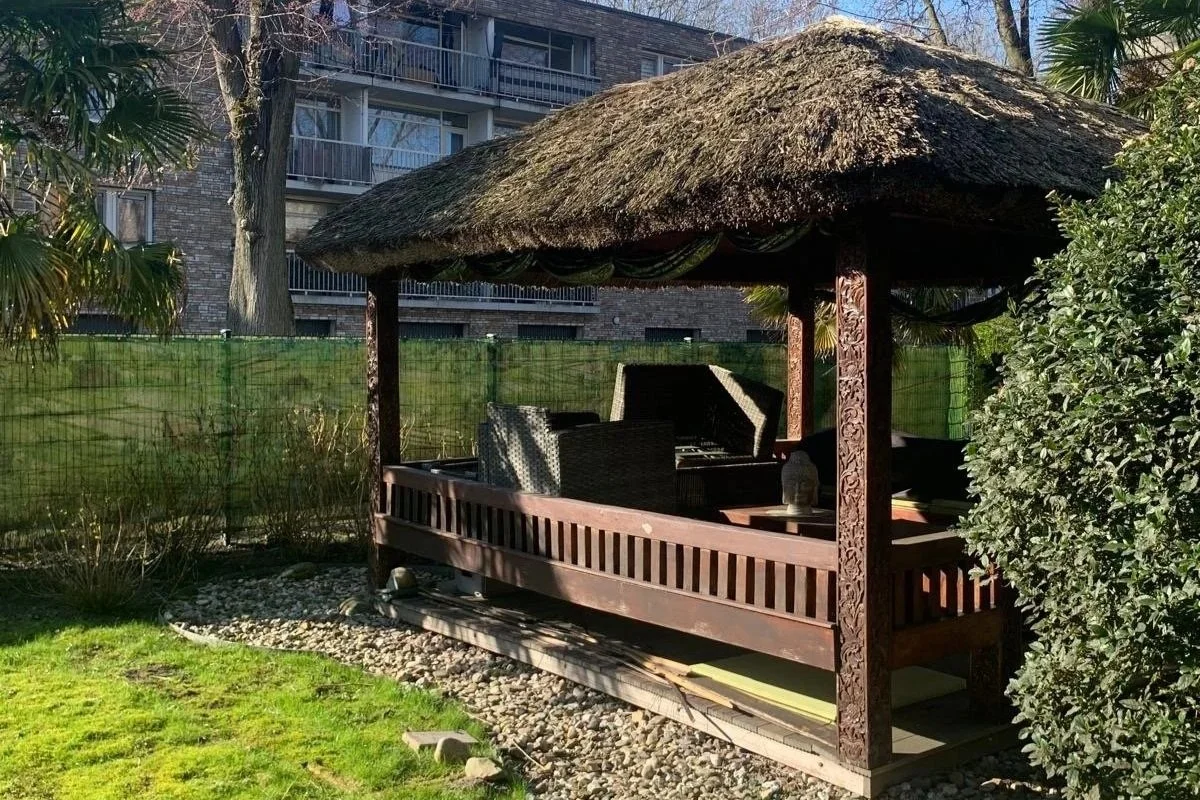 De prieel (ook wel balé-balé genoemd) in de gemeenschappelijke tuin van wooncomplex Lieflijk Indië moet een plek zijn waar mensen samenkomen. Al ruim 15 jaar staat de prieel gezichtsbepalend in de tuin en het geeft het net die oosterse sfeer die de gemeenschappelijke tuin van het wooncomplex Lieflijk Indië uitstraalt. Maar de tand des tijds heeft in die 15 jaar wel haar tol geeist. Het is de hoogste tijd dat de balé-balé gerenoveerd gaat worden. Het rieten dak is kaalgeplukt door de vogels voor hun eigen nestje en daardoor lekt het en aan een kant van de prieel is een verzakking.